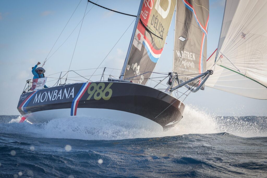 Quentin Mocudet (Monbana) a franchi la ligne d’arrivée de La Boulangère Mini Transat en deuxième position dans la catégorie série, au terme d’une lutte acharnée avec Amaury Guérin jusqu’aux derniers instants. « Depuis trois jours, nous nous croisons sans cesse, parfois on se perd de vue, puis on se retrouve », raconte Quentin, exténué mais radieux sur le ponton de Saint-François. « Jusqu’à cette nuit, alors que je sortais d’une sieste, j’ai revu mes concurrents à l’AIS et il a fallu continuer à contrôler. Cela ne s’arrêtait jamais. Des grains sont arrivés et tout est devenu incertain : un coup Amaury Guérin reprenait l’avantage, un coup je revenais. Il fallait rester patient et surtout ne pas commettre d’erreur. J’étais soulagé que ça se termine sur une deuxième place plutôt qu’une quatrième. »