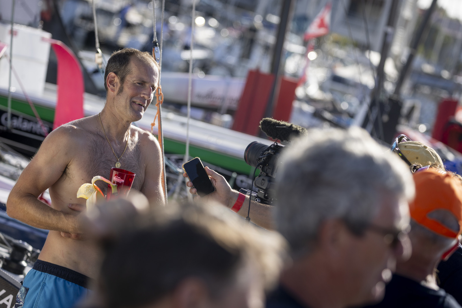 « C’était sympa. J’ai découvert les sargasses, les grains… Je me suis demandé ce que c’était, ces grains, avec les nuages blancs et les nuages noirs, et j’ai passé trois jours dedans ! Ça a laissé quelques dégâts, mais ce n’est pas grave. C’est une très belle expérience, une belle aventure. Une bonne expé’, j’ai bien kiffé. Le final, avec les deux acolytes qui arrivent et Thibaut devant, c’était un régal. On s’était croisés quinze jours avant, on ne s’était plus revus, et on s’est retrouvés. On était sous les grains à faire du tricotage, on s’est tiré la bourre, c’était génial. On a l’impression d’arriver au paradis ici : c’est paisible, on voit des choses qu’on ne voit pas chez nous. Ça fait un maxi décalage. Je n’ai pas l’impression que ça fait deux semaines que je suis parti. C’est une aventure que j’avais envie de faire, je ne regrette pas, c’est vraiment sympa. »