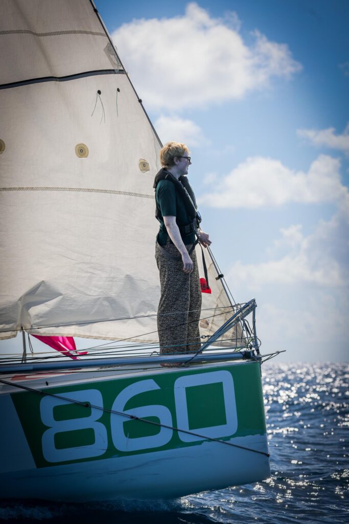 » Je suis très heureuse. C’était très long, je me suis sentie seule. À certains moments, je me sentais toute petite. Quelle joie d’être ici et de retrouver tout le monde. Je savais que je verrais mes amis et c’est ce qui m’a aidée à tenir. J’ai trouvé ça dur, j’ai trouvé ça long, j’ai trouvé ça lent. J’ai perdu un safran il y a une centaine de milles, ce qui m’a fait avancer plus lentement. Ça m’a fait un peu peur, car il n’y a aucun moyen de s’arrêter et de réparer en route. Mais j’ai continué et réussi à tracer ma route.